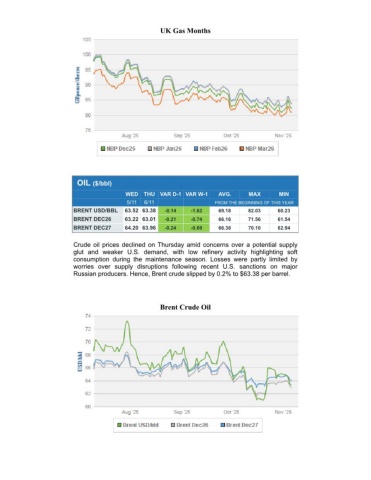 UK Gas MonthsOIL ($/bbl) WEDTHU VAR D-1 VAR W-1AVG.MAXMIN 5/116/11FROM THE BEGINNING OF THIS YEARBRENT USD/BBL63.52 63.38-0.14-1.6269.1882.0360.23BRENT DEC2663.22 63.01-0.21-0.7466.1671.5661.54BRENT DEC2764.20 63.96-0.24-0.6966.3870.1062.94Crude oil prices declined on Thursday amid concerns over a potential supplyglut and weaker U.S. demand, with low refinery activity highlighting softconsumption during the maintenance season. Losses were partly limited byworries over supply disruptions following recent U.S. sanctions on majorRussian producers. Hence, Brent crude slipped by 0.2% to $63.38 per barrel.Brent Crude Oil