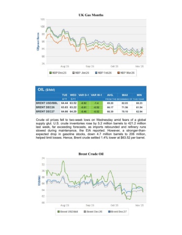 UK Gas MonthsOIL ($/bbl) TUEWED VAR D-1 VAR W-1AVG.MAXMIN 4/115/11FROM THE BEGINNING OF THIS YEARBRENT USD/BBL64.44 63.52-0.92-1.469.2082.0360.23BRENT DEC2663.83 63.22-0.61-0.5266.1771.5661.54BRENT DEC2764.66 64.20-0.46-0.5266.3970.1062.94Crude oil prices fell to two-week lows on Wednesday amid fears of a globalsupply glut. U.S. crude inventories rose by 5.2 million barrels to 421.2 millionlast week, far exceeding forecasts, as imports rebounded and refinery runsslowed during maintenance, the EIA reported. However, a stronger-than-expected drop in gasoline stocks, down 4.7 million barrels to 206 million,helped limit losses. Hence, Brent crude settled 1.4% lower at $63.52 per barrel.Brent Crude Oil