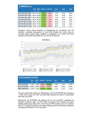 CARBON (€/T) TUE WED VAR D-1 VAR W-1AVG.MAXMIN 4/115/11FROM THE BEGINNING OF THIS YEARCO2 EUA DEC 202582.31 81.49-0.822.6873.4183.9360.94CO2 EUA DEC 202684.41 83.58-0.832.7475.4086.3562.54CO2 EUA DEC 202786.73 85.89-0.842.877.6989.0764.54CO2 EUA DEC 202889.33 88.52-0.812.8880.2691.9466.86UK ETS DEC 25 EUR 66.57 65.10-1.472.2456.9067.0437.35UK ETS DEC 26 EUR 69.48 67.96-1.522.3259.5370.0439.48UK ETS DEC 27 EUR 72.55 71.02-1.532.4562.3273.1442.14European carbon prices declined on Wednesday as uncertainty over EUministers’ overnight discussions on the 2040 climate law, which aims toincrease carbon credit usage, weighed on sentiment. As a result, the EUAsexpiring in Dec-2025 decreased by 1% to 81.49 EUR/tonne.CO2 EUAEXCHANGE RATES TUEWEDVAR D-1 VAR W-1AVG.MAXMIN 4/115/11FROM THE BEGINNING OF THIS YEARRATE EUR/USD1.1491 1.14920.0001-0.01441.12401.18371.0198RATE EUR/GBP0.8795 0.88100.00150.00030.85330.88160.8253RATE GBP/EUR1.1370 1.1351-0.0019-0.00041.17221.21171.1343The euro held rather steady on Wednesday, with the EUR/USD pair closing at1.1492, after strong U.S. ADP and ISM data lowered the odds of a DecemberFed rate cut to 62%.Meanwhile, the EUR/GBP rate gained 0.2% to end at 0.8810, supported bystronger Eurozone data, as the HCOB Composite PMI showed the bloc’sfastest growth since May 2023. The Services PMI climbed to 53.0 in Octoberfrom 51.3, beating forecasts, with Spain leading gains and Germany posting itsstrongest performance in over two years.
