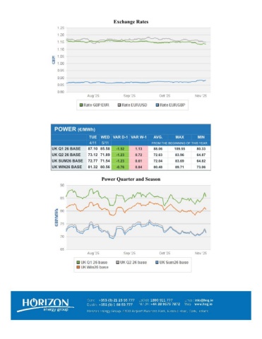 Exchange RatesPOWER (€/MWh) TUEWED VAR D-1 VAR W-1AVG.MAXMIN 4/115/11FROM THE BEGINNING OF THIS YEARUK Q1 26 BASE87.10 85.58-1.521.1388.06109.5580.33UK Q2 26 BASE73.12 71.89-1.230.7272.6383.9664.87UK SUM26 BASE72.77 71.54-1.230.6172.0483.6964.82UK WIN26 BASE81.32 80.56-0.760.8480.4889.7173.06Power Quarter and Season