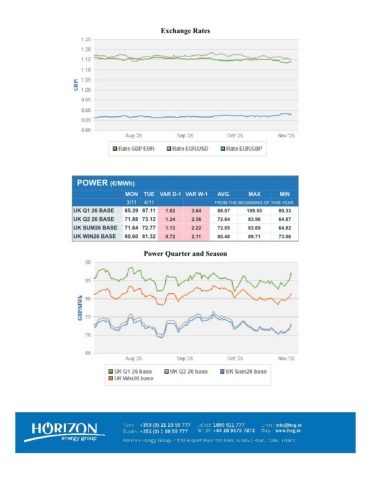 Exchange RatesPOWER (€/MWh) MONTUE VAR D-1 VAR W-1AVG.MAXMIN 3/114/11FROM THE BEGINNING OF THIS YEARUK Q1 26 BASE85.29 87.111.823.6488.07109.5580.33UK Q2 26 BASE71.88 73.121.242.3672.6483.9664.87UK SUM26 BASE71.64 72.771.132.2272.0583.6964.82UK WIN26 BASE80.60 81.320.722.1180.4889.7173.06Power Quarter and Season