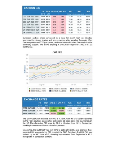 CARBON (€/T) FRIMON VAR D-1 VAR W-1AVG.MAXMIN 31/10 3/11FROM THE BEGINNING OF THIS YEARCO2 EUA DEC 202578.54 81.202.663.4373.3383.9360.94CO2 EUA DEC 202680.58 83.282.73.4975.3286.3562.54CO2 EUA DEC 202782.85 85.602.753.5777.6189.0764.54CO2 EUA DEC 202885.41 88.202.793.6480.1891.9466.86UK ETS DEC 25 EUR 63.83 66.152.323.5256.8267.0437.35UK ETS DEC 26 EUR 66.67 69.072.43.6359.4570.0439.48UK ETS DEC 27 EUR 69.66 72.152.493.6962.2373.1442.14European carbon prices advanced to a near ten-month high on Monday,supported by strong buying and short-covering after weather forecasts liftedGerman power and TTF gas prices, and amid news of further German industrialelectricity support. The EUAs expiring in Dec-2025 surged by 3.4% to 81.20EUR/tonne.CO2 EUAEXCHANGE RATES FRIMONVAR D-1 VAR W-1AVG.MAXMIN 31/103/11FROM THE BEGINNING OF THIS YEARRATE EUR/USD1.1554 1.1514-0.004-0.01261.12381.18371.0198RATE EUR/GBP0.8816 0.8765-0.00510.00440.85320.88160.8253RATE GBP/EUR1.1343 1.14090.0066-0.00581.17251.21171.1343The EUR/USD pair declined by 0.4% to 1.1514, with the US Dollar supportedby the Fed’s cautious stance after last week’s 25-basis-point rate cut. Moreover,the US Manufacturing PMI rose to 52.5 in October from 52 in September,marking three consecutive months of expansion.Meanwhile, the EUR/GBP rate lost 0.6% to settle at 0.8765, as a stronger-than-expected UK Manufacturing PMI boosted the GBP. October’s final UK PMI wasrevised up to 49.7 from 49.6, showing improvement from September’s 46.2,though still in contraction territory.