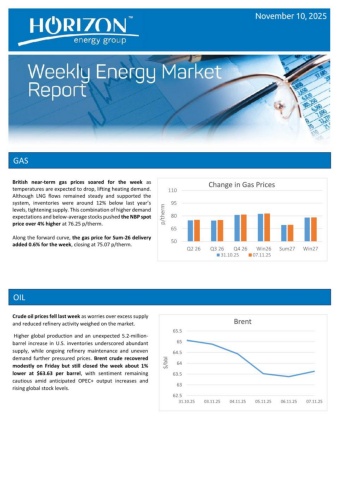 GAS OIL Crude oil prices fell last week as worries over excess supply and reduced refinery activity weighed on the market. Higher global production and an unexpected 5.2-million-barrel increase in U.S. inventories underscored abundant supply, while ongoing refinery maintenance and uneven demand further pressured prices. Brent crude recovered modestly on Friday but still closed the week about 1% lower at $63.63 per barrel , with sentiment remaining cautious amid anticipated OPEC+ output increases and rising global stock levels. November 10, 2025 50658095110Q2 26Q3 26Q4 26Win26Sum27Win27p/thermChange in Gas Prices31.10.2507.11.2562.56363.56464.56565.531.10.2503.11.2504.11.2505.11.2506.11.2507.11.25$/bblBrent British near-term gas prices soared for the week as temperatures are expected to drop, lifting heating demand. Although LNG flows remained steady and supported the system, inventories were around 12% below last year’s levels, tightening supply. This combination of higher demand expectations and below-average stocks pushed the NBP spot price over 4% higher at 76.25 p/therm. Along the forward curve, the gas price for Sum-26 delivery added 0.6% for the week, closing at 75.07 p/therm.