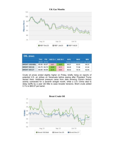 UK Gas MonthsOIL ($/bbl) THUFRIVAR D-1 VAR W-1AVG.MAXMIN 30/10 31/10FROM THE BEGINNING OF THIS YEARBRENT USD/BBL65.00 65.070.07-0.8769.2782.0360.23BRENT DEC2663.75 63.72-0.030.1166.2071.5661.54BRENT DEC2764.65 64.54-0.110.0366.4270.1062.94Crude oil prices ended slightly higher on Friday, briefly rising on reports ofpotential U.S. air strikes on Venezuela before easing after President Trumpdenied them. Additional pressure came from data showing China’s factoryactivity contracted for a seventh straight month, while a U.S.–China deal todelay tariffs by a year did little to ease broader tensions. Brent crude added0.1% to $65.07 per barrel.Brent Crude Oil