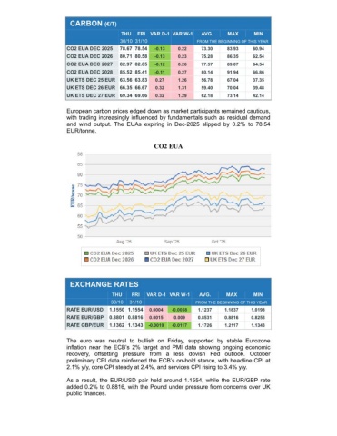 CARBON (€/T) THUFRI VAR D-1 VAR W-1AVG.MAXMIN 30/10 31/10FROM THE BEGINNING OF THIS YEARCO2 EUA DEC 202578.67 78.54-0.130.2273.3083.9360.94CO2 EUA DEC 202680.71 80.58-0.130.2375.2886.3562.54CO2 EUA DEC 202782.97 82.85-0.120.2677.5789.0764.54CO2 EUA DEC 202885.52 85.41-0.110.2780.1491.9466.86UK ETS DEC 25 EUR 63.56 63.830.271.2656.7867.0437.35UK ETS DEC 26 EUR 66.35 66.670.321.3159.4070.0439.48UK ETS DEC 27 EUR 69.34 69.660.321.2962.1873.1442.14European carbon prices edged down as market participants remained cautious,with trading increasingly influenced by fundamentals such as residual demandand wind output. The EUAs expiring in Dec-2025 slipped by 0.2% to 78.54EUR/tonne.CO2 EUAEXCHANGE RATES THUFRIVAR D-1 VAR W-1AVG.MAXMIN 30/1031/10FROM THE BEGINNING OF THIS YEARRATE EUR/USD1.1550 1.15540.0004-0.00581.12371.18371.0198RATE EUR/GBP0.8801 0.88160.00150.0090.85310.88160.8253RATE GBP/EUR1.1362 1.1343-0.0019-0.01171.17261.21171.1343The euro was neutral to bullish on Friday, supported by stable Eurozoneinflation near the ECB’s 2% target and PMI data showing ongoing economicrecovery, offsetting pressure from a less dovish Fed outlook. Octoberpreliminary CPI data reinforced the ECB’s on-hold stance, with headline CPI at2.1% y/y, core CPI steady at 2.4%, and services CPI rising to 3.4% y/y.As a result, the EUR/USD pair held around 1.1554, while the EUR/GBP rateadded 0.2% to 0.8816, with the Pound under pressure from concerns over UKpublic finances.