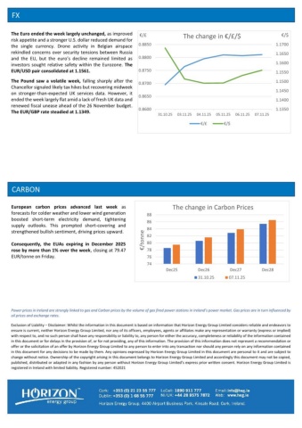 FX CARBON Power prices in Ireland are strongly linked to gas and Carbon prices by the volume of gas fired power stations in Ireland’s power market. Gas prices are in turn influenced by oil prices and exchange rates. Exclusion of Liability Disclaimer: Whilst the information in this document is based on information that Horizon Energy Group Limited considers reliable and endeavors to –ensure is current, neither Horizon Energy Group Limited, nor any of its officers, employees, agents or affiliates make any representation or warranty (express or implied) with respect to, and no such person shall have any responsibility or liability to, any person for either the accuracy, completeness or reliability of the information contained in this document or for delays in the provision of, or for not providing, any of this information. The provision of this information does not represent a recommendation or offer or the solicitation of an offer by Horizon Energy Group Limited to any person to enter into any transaction nor should any person rely on any information contained in this document for any decisions to be made by them. Any opinions expressed by Horizon Energy Group Limited in this document are personal to it and are subject to change without notice. Ownership of the copyright arising in this document belongs to Horizon Energy Group Limited and accordingly this document may not be copied, published, distributed or adapted in any fashion by any person without Horizon Energy Group Limited’s express prior written consent. Horizon Energy Group Limited is registered in Ireland with limited liability. Registered number: 452021 European carbon prices advanced last week as forecasts for colder weather and lower wind generation boosted short-term electricity demand, tightening supply outlooks. This prompted short-covering and strengthened bullish sentiment, driving prices upward. Consequently, the EUAs expiring in December 2025 rose by more than 1% over the week, closing at 79.47 EUR/tonne on Friday. 7476788082848688Dec25Dec26Dec27Dec28€/tonneThe change in Carbon Prices31.10.2507.11.251.13501.14001.14501.15001.15501.16001.16501.17000.86000.86500.87000.87500.88000.885031.10.2503.11.2504.11.2505.11.2506.11.2507.11.25€/$€/£The change in €/£/$ €/£€/$The Euro ended the week largely unchanged, as improved risk appetite and a stronger U.S. dollar reduced demand for the single currency. Drone activity in Belgian airspace rekindled concerns over security tensions between Russia and the EU, but the euro’s decline remained limited as investors sought relative safety within the Eurozone. The EUR/USD pair consolidated at 1.1561. The Pound saw a volatile week, falling sharply after the Chancellor signaled likely tax hikes but recovering midweek on stronger-than-expected UK services data. However, it ended the week largely flat amid a lack of fresh UK data and renewed fiscal unease ahead of the 26 November budget. The EUR/GBP rate steadied at 1.1349.