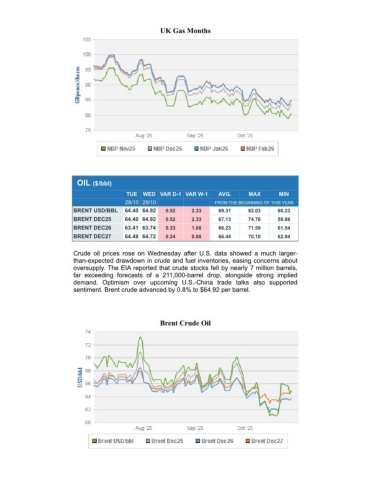 UK Gas MonthsOIL ($/bbl) TUEWED VAR D-1 VAR W-1AVG.MAXMIN 28/10 29/10FROM THE BEGINNING OF THIS YEARBRENT USD/BBL64.40 64.920.522.3369.3182.0360.23BRENT DEC2564.40 64.920.522.3367.1374.7659.86BRENT DEC2663.41 63.740.331.0866.2371.5661.54BRENT DEC2764.48 64.720.240.8866.4470.1062.94Crude oil prices rose on Wednesday after U.S. data showed a much larger-than-expected drawdown in crude and fuel inventories, easing concerns aboutoversupply. The EIA reported that crude stocks fell by nearly 7 million barrels,far exceeding forecasts of a 211,000-barrel drop, alongside strong implieddemand. Optimism over upcoming U.S.-China trade talks also supportedsentiment. Brent crude advanced by 0.8% to $64.92 per barrel.Brent Crude Oil