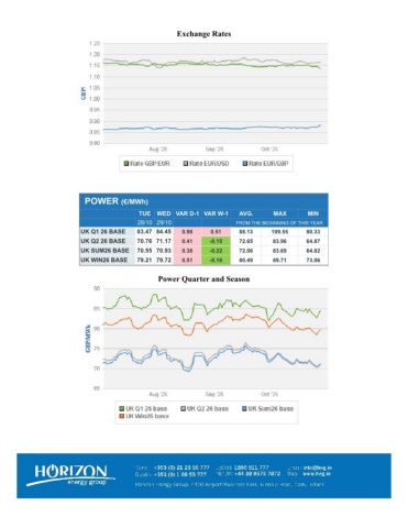 Exchange RatesPOWER (€/MWh) TUEWED VAR D-1 VAR W-1AVG.MAXMIN 28/10 29/10FROM THE BEGINNING OF THIS YEARUK Q1 26 BASE83.47 84.450.980.5188.13109.5580.33UK Q2 26 BASE70.76 71.170.41-0.1572.6583.9664.87UK SUM26 BASE70.55 70.930.38-0.2272.0683.6964.82UK WIN26 BASE79.21 79.720.51-0.1880.4989.7173.06Power Quarter and Season