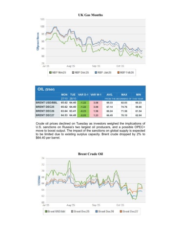 UK Gas MonthsOIL ($/bbl) MONTUE VAR D-1 VAR W-1AVG.MAXMIN 27/10 28/10FROM THE BEGINNING OF THIS YEARBRENT USD/BBL65.62 64.40-1.223.0869.3382.0360.23BRENT DEC2565.62 64.40-1.223.0867.1474.7659.86BRENT DEC2663.64 63.41-0.231.5666.2471.5661.54BRENT DEC2764.53 64.48-0.051.2366.4570.1062.94Crude oil prices declined on Tuesday as investors weighed the implications ofU.S. sanctions on Russia’s two largest oil producers, and a possible OPEC+move to boost output. The impact of the sanctions on global supply is expectedto be limited due to existing surplus capacity. Brent crude dropped by 2% to$64.40 per barrel.Brent Crude Oil