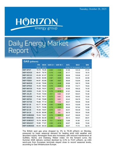 Tuesday, October 28, 2025GAS (p/therm) FRIMON VAR D-1 VAR W-1AVG.MAXMIN 24/10 27/10FROM THE BEGINNING OF THIS YEARNBP SPOT78.70 76.28-2.42-1.3291.98145.3067.83NBP NOV2580.51 78.76-1.75-1.5497.17133.5278.76NBP DEC2583.29 81.57-1.72-0.5499.36135.0081.57NBP JAN2684.83 82.96-1.87-0.6399.94134.3982.96NBP FEB2684.97 83.08-1.89-0.6799.49132.9483.08NBP MAR2681.62 79.88-1.74-0.4895.68128.7579.88NBP APR2678.39 76.64-1.75-0.0387.89112.7176.64NBP MAY2676.26 74.51-1.750.1283.65106.2274.39NBP JUN2675.49 73.74-1.75-0.1881.81104.4471.89NBP JUL2675.34 73.64-1.70.0281.67104.0172.46NBP AUG2676.42 74.71-1.710.0182.46104.4273.26NBP SEP2677.40 75.69-1.710.0183.43104.7973.41NBP OCT2678.68 77.14-1.541.1485.27105.0976.00NBP Q1 2683.77 81.94-1.83-0.5998.33132.0081.94NBP Q2 2676.71 74.96-1.75-0.0384.44107.6474.96NBP Q3 2676.38 74.67-1.710.0182.51104.4073.04NBP Q4 2682.39 80.98-1.410.688.18105.3479.86NBP SUM202676.54 74.81-1.73-0.0183.47106.0074.01NBP WIN202683.68 82.30-1.380.489.13104.6180.91NBP SUM202770.79 69.59-1.2-0.1872.9981.8967.41NBP WIN202778.90 77.87-1.03-0.1680.0786.8675.08NBP SUM202865.35 64.33-1.02-0.6566.4771.7262.79The British spot gas price dropped by 3% to 76.28 p/therm on Monday,pressured by lower seasonal demand for heating amid mild weather andabundant supply. Norwegian flows also increased, with reduced maintenance atGullfaks, Norne, and Oseberg, Weber noted. On the forward curve, theSummer 2026 delivery contract declined by 2.3% to 74.81 p/therm, as LNGsend-outs from European terminals stayed close to record seasonal levels,according to Gas Infrastructure Europe.