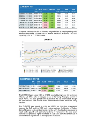 CARBON (€/T) FRIMON VAR D-1 VAR W-1AVG.MAXMIN 24/10 27/10FROM THE BEGINNING OF THIS YEARCO2 EUA DEC 202578.32 77.77-0.55-2.0573.2083.9360.94CO2 EUA DEC 202680.35 79.79-0.56-2.0775.1886.3562.54CO2 EUA DEC 202782.59 82.03-0.56-2.0377.4789.0764.54CO2 EUA DEC 202885.14 84.56-0.58-2.0280.0491.9466.86UK ETS DEC 25 EUR 62.57 62.630.06-2.9356.6567.0437.35UK ETS DEC 26 EUR 65.36 65.440.08-3.0259.2870.0439.48UK ETS DEC 27 EUR 68.37 68.460.09-3.0862.0573.1442.14European carbon prices fell on Monday, weighed down by ongoing selling amidweak weather-driven fundamentals. As a result, the EUAs expiring in Dec-2025dipped by 0.7% to 77.77 EUR/tonne.CO2 EUAEXCHANGE RATES FRIMONVAR D-1 VAR W-1AVG.MAXMIN 24/1027/10FROM THE BEGINNING OF THIS YEARRATE EUR/USD1.1612 1.16400.0028-0.00151.12301.18371.0198RATE EUR/GBP0.8726 0.8721-0.00050.0030.85250.87480.8253RATE GBP/EUR1.1460 1.14670.0007-0.00391.17331.21171.1431The EUR/USD pair added 0.2% to 1.1640, boosted by improved risk sentimentfollowing US–China talks in Malaysia ahead of the Trump–Xi Jinping summit inSouth Korea. The euro gained some support as the US dollar eased, thoughthe pair remained near familiar levels ahead of the Federal Reserve’s policydecision.The EUR/GBP rate eased by 0.1% to 0.8721, as diverging expectationsbetween the BoE and the ECB kept traders cautious. Anticipation of furtherBank of England easing and concerns over the UK’s fiscal outlook continued toweigh on the pound, while political uncertainty in France drove the euro lower.Markets now price in a higher likelihood of a 25-basis-point November cut, incontrast to ECB signals that its easing cycle is likely over.
