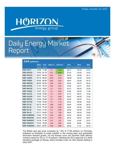 Friday, October 24, 2025GAS (p/therm) WEDTHUVAR D-1 VAR W-1AVG.MAXMIN 22/10 23/10FROM THE BEGINNING OF THIS YEARNBP SPOT76.50 77.901.4-3.4192.17145.3067.83NBP NOV2579.53 81.742.21-0.6397.34133.5279.53NBP DEC2582.27 84.302.030.3399.52135.0082.11NBP JAN2683.79 85.842.050.45100.09134.3983.59NBP FEB2683.93 85.952.020.4499.63132.9483.75NBP MAR2680.63 82.521.890.4395.82128.7580.36NBP APR2677.47 79.121.650.8787.99112.7176.67NBP MAY2675.12 76.621.50.7483.73106.2274.39NBP JUN2674.67 76.171.50.8481.88104.4471.89NBP JUL2674.49 75.991.50.9781.74104.0172.46NBP AUG2675.57 77.071.50.8982.53104.4273.26NBP SEP2676.55 78.051.50.7983.49104.7973.41NBP OCT2677.80 79.301.51.7285.34105.0976.00NBP Q1 2682.75 84.731.980.4498.48132.0082.53NBP Q2 2675.75 77.301.550.8284.52107.6474.99NBP Q3 2675.53 77.031.50.8982.58104.4073.04NBP Q4 2681.71 83.021.311.0688.24105.3479.86NBP SUM202675.64 77.161.520.8583.54106.0074.01NBP WIN202682.95 84.261.310.8289.18104.6180.91NBP SUM202770.19 71.401.210.873.0281.8967.41NBP WIN202778.33 79.551.220.9580.0986.8675.08NBP SUM202864.91 65.971.060.0666.4871.7262.79The British spot gas price increased by 1.8% to 77.90 p/therm on Thursday,bolstered by forecasts of cooler weather in the coming days and anticipatedshort-term demand growth. On the forward curve, the Summer 2026 deliverycontract soared by 2% to 77.16 p/therm, following the EU’s approval of a freshsanctions package on Russia, which includes a ban on LNG imports starting inearly 2027.