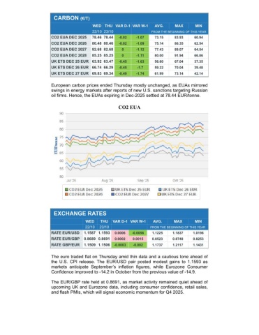 CARBON (€/T) WED THU VAR D-1 VAR W-1AVG.MAXMIN 22/10 23/10FROM THE BEGINNING OF THIS YEARCO2 EUA DEC 202578.46 78.44-0.02-1.0773.1583.9360.94CO2 EUA DEC 202680.48 80.46-0.02-1.0975.1486.3562.54CO2 EUA DEC 202782.68 82.680-1.1277.4389.0764.54CO2 EUA DEC 202885.25 85.250-1.1180.0091.9466.86UK ETS DEC 25 EUR 63.92 63.47-0.45-1.6356.6067.0437.35UK ETS DEC 26 EUR 66.74 66.29-0.45-1.759.2270.0439.48UK ETS DEC 27 EUR 69.83 69.34-0.49-1.7461.9973.1442.14European carbon prices ended Thursday mostly unchanged, as EUAs mirroredswings in energy markets after reports of new U.S. sanctions targeting Russianoil firms. Hence, the EUAs expiring in Dec-2025 settled at 78.44 EUR/tonne.CO2 EUAEXCHANGE RATES WEDTHUVAR D-1 VAR W-1AVG.MAXMIN 22/1023/10FROM THE BEGINNING OF THIS YEARRATE EUR/USD1.1587 1.15930.0006-0.00561.12251.18371.0198RATE EUR/GBP0.8689 0.86910.00020.00150.85230.87480.8253RATE GBP/EUR1.1509 1.1506-0.0003-0.0021.17371.21171.1431The euro traded flat on Thursday amid thin data and a cautious tone ahead ofthe U.S. CPI release. The EUR/USD pair posted modest gains to 1.1593 asmarkets anticipate September’s inflation figures, while Eurozone ConsumerConfidence improved to -14.2 in October from the previous value of -14.9.The EUR/GBP rate held at 0.8691, as market activity remained quiet ahead ofupcoming UK and Eurozone data, including consumer confidence, retail sales,and flash PMIs, which will signal economic momentum for Q4 2025.
