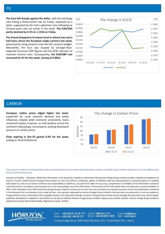 FX CARBON Power prices in Ireland are strongly linked to gas and Carbon prices by the volume of gas fired power stations in Ireland’s power market. Gas prices are in turn influenced by oil prices and exchange rates. Exclusion of Liability Disclaimer: Whilst the information in this document is based on information that Horizon Energy Group Limited considers reliable and endeavors to –ensure is current, neither Horizon Energy Group Limited, nor any of its officers, employees, agents or affiliates make any representation or warranty (express or implied) with respect to, and no such person shall have any responsibility or liability to, any person for either the accuracy, completeness or reliability of the information contained in this document or for delays in the provision of, or for not providing, any of this information. The provision of this information does not represent a recommendation or offer or the solicitation of an offer by Horizon Energy Group Limited to any person to enter into any transaction nor should any person rely on any information contained in this document for any decisions to be made by them. Any opinions expressed by Horizon Energy Group Limited in this document are personal to it and are subject to change without notice. Ownership of the copyright arising in this document belongs to Horizon Energy Group Limited and accordingly this document may not be copied, published, distributed or adapted in any fashion by any person without Horizon Energy Group Limited’s express prior written consent. Horizon Energy Group Limited is registered in Ireland with limited liability. Registered number: 452021 European carbon prices edged higher last week, supported by usual seasonal demand and policy influences, despite wider economic uncertainty. Gains remained modest, however, as mild weather across the continent reduced gas consumption, putting downward pressure on carbon prices. EUAs expiring in Dec-25 gained 0.3% for the week, ending at 78.54 EUR/tonne. 74767880828486Dec25Dec26Dec27Dec28€/tonneThe change in Carbon Prices24.10.2531.10.251.15001.15201.15401.15601.15801.16001.16201.16401.16600.86600.86800.87000.87200.87400.87600.87800.88000.88200.884024.10.2527.10.2528.10.2529.10.2530.10.2531.10.25€/$€/£The change in €/£/$ €/£€/$The Euro fell sharply against the dollar, with the exchange rate hitting a three-month low on Friday, impacted by a dollar supported by the Fed’s optimistic tone following its 25-basis-point rate cut earlier in the week. The EUR/USD parity declined by 0.5% to 1.1554 on Friday. The Pound dropped to its lowest level in almost two and a half years versus the European single currency last week, pressured by rising concerns over the UK’s autumn budget. Meanwhile, the Euro was buoyed by stronger-than-expected Eurozone GDP figures and the ECB’s decision to maintain interest rates. Consequently, the EUR/GBP rate increased by 1% for the week, closing at 0.8816.