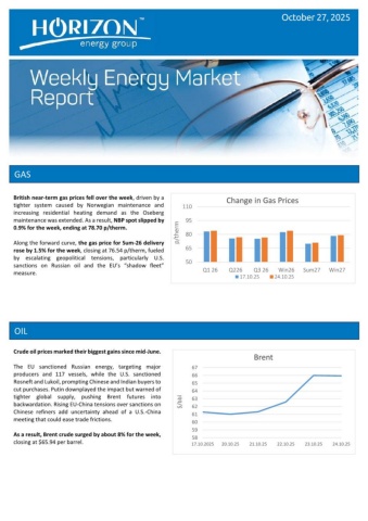 GAS OIL Crude oil prices marked their biggest gains since mid-June. The EU sanctioned Russian energy, targeting major producers and 117 vessels, while the U.S. sanctioned Rosneft and Lukoil, prompting Chinese and Indian buyers to cut purchases. Putin downplayed the impact but warned of tighter global supply, pushing Brent futures into backwardation. Rising EU-China tensions over sanctions on Chinese refiners add uncertainty ahead of a U.S.-China meeting that could ease trade frictions. As a result, Brent crude surged by about 8% for the week, closing at $65.94 per barrel. October 27, 2025 50658095110Q1 26Q226Q3 26Win26Sum27Win27p/thermChange in Gas Prices17.10.2524.10.255859606162636465666717.10.202520.10.2521.10.2522.10.2523.10.2524.10.25$/bblBrent British near-term gas prices fell over the week, driven by a tighter system caused by Norwegian maintenance and increasing residential heating demand as the Oseberg maintenance was extended. As a result, NBP spot slipped by 0.9% for the week, ending at 78.70 p/therm. Along the forward curve, the gas price for Sum-26 delivery rose by 1.5% for the week, closing at 76.54 p/therm, fueled by escalating geopolitical tensions, particularly U.S. sanctions on Russian oil and the EU’s “shadow fleet” measure.