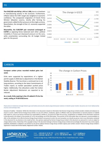 FX CARBON Power prices in Ireland are strongly linked to gas and Carbon prices by the volume of gas fired power stations in Ireland’s power market. Gas prices are in turn influenced by oil prices and exchange rates. Exclusion of Liability Disclaimer: Whilst the information in this document is based on information that Horizon Energy Group Limited considers reliable and endeavors to –ensure is current, neither Horizon Energy Group Limited, nor any of its officers, employees, agents or affiliates make any representation or warranty (express or implied) with respect to, and no such person shall have any responsibility or liability to, any person for either the accuracy, completeness or reliability of the information contained in this document or for delays in the provision of, or for not providing, any of this information. The provision of this information does not represent a recommendation or offer or the solicitation of an offer by Horizon Energy Group Limited to any person to enter into any transaction nor should any person rely on any information contained in this document for any decisions to be made by them. Any opinions expressed by Horizon Energy Group Limited in this document are personal to it and are subject to change without notice. Ownership of the copyright arising in this document belongs to Horizon Energy Group Limited and accordingly this document may not be copied, published, distributed or adapted in any fashion by any person without Horizon Energy Group Limited’s express prior written consent. Horizon Energy Group Limited is registered in Ireland with limited liability. Registered number: 452021 European carbon prices recorded modest gains last week. EUAs were supported by expectations of a tighter permit supply in 2026 due to adjustments in the Market Stability Reserve. This has driven a continued rise in net long positions, according to the latest Commitments of Traders report, as market speculation pushed prices higher. Additionally, free allocations under the Carbon Border Adjustment Mechanism are expected to be reduced. As a result, EUAs expiring in Dec-25 added 0.7% for the week, ending at 79.68 EUR/tonne. 7476788082848688Dec25Dec26Dec27Dec28€/tonneThe change in Carbon Prices03.10.2510.10.251.14501.15001.15501.16001.16501.17001.17500.86500.86600.86700.86800.86900.87000.87100.872003.10.2506.10.2507.10.2508.10.2509.10.2510.10.25€/$€/£The change in €/£/$ €/£€/$The EUR/USD rate fell by 1.4% to 1.568, due to a slowdown in manufacturing activity in the eurozone. Furthermore, inflation above the ECB’s target also weighed on economic confidence. The unexpected resignation of French Prime Minister Sébastien Lecornu, shortly after forming his government, added further pressure on the single currency. Nevertheless, the strength of the U.S. economy supported the dollar. Meanwhile, the EUR/GBP pair remained unchanged at 0.8709 as opposing forces balanced each other: political instability in France put downward pressure on the euro, while uncertainties surrounding the UK budget limited gains for the pound.