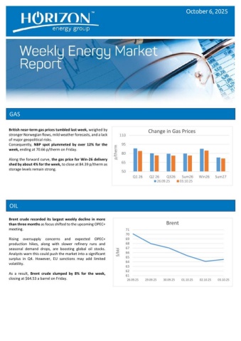 GAS OIL Brent crude recorded its largest weekly decline in more than three months as focus shifted to the upcoming OPEC+ meeting. Rising oversupply concerns and expected OPEC+ production hikes, along with slower refinery runs and seasonal demand drops, are boosting global oil stocks. Analysts warn this could push the market into a significant surplus in Q4. However, EU sanctions may add limited volatility. As a result, Brent crude slumped by 8% for the week, closing at $64.53 a barrel on Friday. October 6, 2025 50658095110Q1 26Q2 26Q326Sum26Win26Sum27p/thermChange in Gas Prices26.09.2503.10.25616263646566676869707126.09.2529.09.2530.09.2501.10.2502.10.2503.10.25$/bblBrentBritish near-term gas prices tumbled last week, weighed by stronger Norwegian flows, mild weather forecasts, and a lack of major geopolitical risks. Consequently, NBP spot plummeted by over 12% for the week, ending at 70.66 p/therm on Friday. Along the forward curve, the gas price for Win-26 delivery shed by about 4% for the week, to close at 84.39 p/therm as storage levels remain strong.