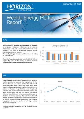 GAS OIL Oil prices experienced modest losses over the week as market participants assessed the implications of the Federal Reserve’s rate cut and the broader shift toward looser monetary policy. Early in the week, prices were supported by supply risks stemming from Ukrainian drone attacks on Russian energy facilities, which heightened concerns over potential disruptions. However, later in the week, prices eased after the U.S. Energy Information Administration (EIA) reported an unexpected increase in distillate inventories, clouding the outlook for demand even as crude oil stocks declined. Overall, the combination of shifting monetary policy expectations and changing supply-demand dynamics resulted in only slight weekly declines in crude prices. Hence, Brent crude dropped by 0.5% for the week, closing at $66.68 a barrel. September 22, 2025 50658095110Q1 26Q2 26Q326Sum26Win26Sum27p/thermChange in Gas Prices12.09.2519.09.25656667686912.09.2515.09.2516.09.2517.09.2518.09.2519.09.25$/bblBrentBritish near-term gas prices moved upwards for the week as temperature projections indicate a drop to levels not experienced since May. Scheduled maintenance across Norway’s gas fleet is progressing steadily, further contributing to the rise in prices. As a result, NBP spot increased by 1% for the week, ending at 79.85 p/therm. Along the forward curve, the gas price for Win-25 delivery slipped by 0.6% for the week, as ample inventory replenishment counterbalanced geopolitical risks.