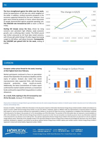 FX CARBON Power prices in Ireland are strongly linked to gas and Carbon prices by the volume of gas fired power stations in Ireland’s power market. Gas prices are in turn influenced by oil prices and exchange rates. Exclusion of Liability Disclaimer: Whilst the information in this document is based on information that Horizon Energy Group Limited considers reliable and endeavors to –ensure is current, neither Horizon Energy Group Limited, nor any of its officers, employees, agents or affiliates make any representation or warranty (express or implied) with respect to, and no such person shall have any responsibility or liability to, any person for either the accuracy, completeness or reliability of the information contained in this document or for delays in the provision of, or for not providing, any of this information. The provision of this information does not represent a recommendation or offer or the solicitation of an offer by Horizon Energy Group Limited to any person to enter into any transaction nor should any person rely on any information contained in this document for any decisions to be made by them. Any opinions expressed by Horizon Energy Group Limited in this document are personal to it and are subject to change without notice. Ownership of the copyright arising in this document belongs to Horizon Energy Group Limited and accordingly this document may not be copied, published, distributed or adapted in any fashion by any person without Horizon Energy Group Limited’s express prior written consent. Horizon Energy Group Limited is registered in Ireland with limited liability. Registered number: 452021 European carbon prices firmed for the week, hovering at their highest level since February. Market participants continued to focus on speculation ahead of the September 30 compliance deadline and the expiry of options. Analysts also noted that recent macroeconomic data supported EUAs, with Eurozone industrial production rising month-on-month. Additionally, the latest Commitments of Traders report confirmed the market’s bullish sentiment, as investment funds continued to expand their long positions in carbon allowances. As a result, EUAs expiring in Dec-25 increased by over 2% for the week , closing at 77.55 EUR/tonne. 7075808590Dec25Dec26Dec27Dec28€/tonneThe change in Carbon Prices12.09.2519.09.251.16501.17001.17501.18001.18500.86000.86200.86400.86600.86800.87000.872012.09.2515.09.2516.09.2517.09.2518.09.2519.09.25€/$€/£The change in €/£/$ €/£€/$The Euro strengthened against the dollar over the week, driven by expectations of Fed rate cuts, which weighed on the dollar. In addition, resilient economic prospects in the eurozone supported demand for the euro. However, Euro gains were limited by protests in France, where thousands of people demonstrated against proposed spending cuts. The EUR/USD rate increased by 0.2% to reach 1.1736 on Friday. Sterling fell sharply versus the Euro, driven by rising concerns over persistent high inflation, weak economic growth, and a softening labor market. The British pound was further pressured as UK fiscal data raised concerns, with 10-year gilt yields hitting 4.7% after August borrowing surged to £18 billion, well above forecasts. Consequently, the EUR/GBP pair gained 0.6% for the week, ending at 0.8708.