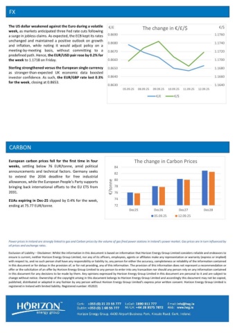 FX CARBON Power prices in Ireland are strongly linked to gas and Carbon prices by the volume of gas fired power stations in Ireland’s power market. Gas prices are in turn influenced by oil prices and exchange rates. Exclusion of Liability Disclaimer: Whilst the information in this document is based on information that Horizon Energy Group Limited considers reliable and endeavors to –ensure is current, neither Horizon Energy Group Limited, nor any of its officers, employees, agents or affiliates make any representation or warranty (express or implied) with respect to, and no such person shall have any responsibility or liability to, any person for either the accuracy, completeness or reliability of the information contained in this document or for delays in the provision of, or for not providing, any of this information. The provision of this information does not represent a recommendation or offer or the solicitation of an offer by Horizon Energy Group Limited to any person to enter into any transaction nor should any person rely on any information contained in this document for any decisions to be made by them. Any opinions expressed by Horizon Energy Group Limited in this document are personal to it and are subject to change without notice. Ownership of the copyright arising in this document belongs to Horizon Energy Group Limited and accordingly this document may not be copied, published, distributed or adapted in any fashion by any person without Horizon Energy Group Limited’s express prior written consent. Horizon Energy Group Limited is registered in Ireland with limited liability. Registered number: 452021 European carbon prices fell for the first time in four weeks, settling below 76 EUR/tonne, amid political announcements and technical factors. Germany seeks to extend the 2034 deadline for free industrial allowances, while the European People’s Party supports bringing back international offsets to the EU ETS from 2031. EUAs expiring in Dec-25 slipped by 0.4% for the week, ending at 75.77 EUR/tonne. 72747678808284Dec25Dec26Dec27Dec28€/tonneThe change in Carbon Prices05.09.2512.09.251.16401.16601.16801.17001.17201.17401.17600.86300.86400.86500.86600.86700.86800.869005.09.2508.09.2509.09.2510.09.2511.09.2512.09.25€/$€/£The change in €/£/$ €/£€/$The US dollar weakened against the Euro during a volatile week, as markets anticipated three Fed rate cuts following a surge in jobless claims. As expected, the ECB kept its rates unchanged and maintained a positive outlook on growth and inflation, while noting it would adjust policy on a meeting-by-meeting basis, without committing to a predefined path. Hence, the EUR/USD pair rose by 0.2% for the week to 1.1718 on Friday. Sterling strengthened versus the European single currency as stronger-than-expected UK economic data boosted investor confidence. As such, the EUR/GBP rate lost 0.3% for the week, closing at 0.8653.