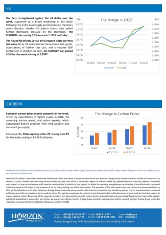 FX CARBON Power prices in Ireland are strongly linked to gas and Carbon prices by the volume of gas fired power stations in Ireland’s power market. Gas prices are in turn influenced by oil prices and exchange rates. Exclusion of Liability Disclaimer: Whilst the information in this document is based on information that Horizon Energy Group Limited considers reliable and endeavors to –ensure is current, neither Horizon Energy Group Limited, nor any of its officers, employees, agents or affiliates make any representation or warranty (express or implied) with respect to, and no such person shall have any responsibility or liability to, any person for either the accuracy, completeness or reliability of the information contained in this document or for delays in the provision of, or for not providing, any of this information. The provision of this information does not represent a recommendation or offer or the solicitation of an offer by Horizon Energy Group Limited to any person to enter into any transaction nor should any person rely on any information contained in this document for any decisions to be made by them. Any opinions expressed by Horizon Energy Group Limited in this document are personal to it and are subject to change without notice. Ownership of the copyright arising in this document belongs to Horizon Energy Group Limited and accordingly this document may not be copied, published, distributed or adapted in any fashion by any person without Horizon Energy Group Limited’s express prior written consent. Horizon Energy Group Limited is registered in Ireland with limited liability. Registered number: 452021 European carbon prices moved upwards for the week, driven by expectations of tighter supply in 2026, the upcoming auction pause, and option expiries, which outweighed bearish pressure from mild weather and abundant gas supply. Consequently, EUAs expiring in Dec-25 rose by over 2% for the week, ending at 83.79 EUR/tonne. 7580859095Dec25Dec26Dec27Dec28€/tonneThe change in Carbon Prices05.12.2512.12.251.15801.16001.16201.16401.16601.16801.17001.17201.17400.87000.87100.87200.87300.87400.87500.87600.877005.12.2508.12.2509.12.2510.12.2511.12.2512.12.25€/$€/£The change in €/£/$ €/£€/$The Euro strengthened against the US dollar over the week, supported by a broad weakening of the dollar following the Fed’s surprisingly accommodative monetary policy decision. Weaker US jobless claims data added further downward pressure on the greenback. The EUR/USD rate rose by 0.7% to reach 1.1731 on Friday. The Pound fell sharply versus the European single currency last week, hit by UK political uncertainty, mixed BoE signals, expectations of further rate cuts, and a surprise GDP contraction in October. As such, the EUR/GBP pair gained 0.5% for the week, closing at 0.8767.