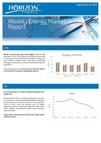 GAS OIL Oil prices declined as markets weighed geopolitical and supply risks. Russia-Ukraine strikes on energy infrastructure and new U.S. sanctions on Iranian-linked shipping added uncertainty, but bearish pressure came from record U.S. crude output at 13.58 mn b/d in June and concerns over U.S. tariffs dampening demand. Caution also prevailed ahead of the OPEC+ meeting, with potential further output increases under discussion. Hence, Brent crude fell by about 4% for the week, closing at $65.50 a barrel. September 8, 2025 50658095110Q1 26Q2 26Q326Sum26Win26Sum27p/thermChange in Gas Prices29.08.2505.09.25636465666768697029.08.2501.09.2502.09.2503.09.2504.09.2505.09.25$/bblBrentBritish near-term gas prices eased slightly, with the NBP spot down 0.7% to 77.35 p/therm. Early declines were linked to weak Asian LNG demand and comfortable storage, but focus shifted to bullish factors after Gassco announced Norwegian maintenance cuts of over 100 mcm/d through 19 September. Along the forward curve, the gas price for Win-25 delivery rose by 0.8% for the week, surpassing 85 p/therm.