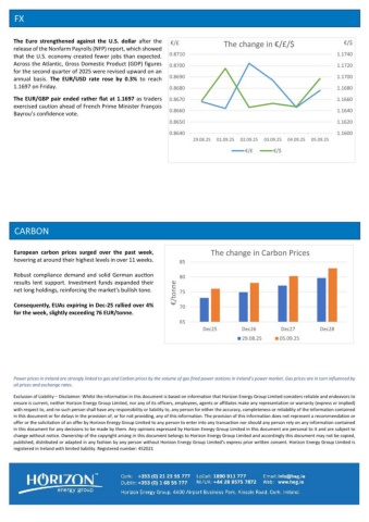 FX CARBON Power prices in Ireland are strongly linked to gas and Carbon prices by the volume of gas fired power stations in Ireland’s power market. Gas prices are in turn influenced by oil prices and exchange rates. Exclusion of Liability Disclaimer: Whilst the information in this document is based on information that Horizon Energy Group Limited considers reliable and endeavors to –ensure is current, neither Horizon Energy Group Limited, nor any of its officers, employees, agents or affiliates make any representation or warranty (express or implied) with respect to, and no such person shall have any responsibility or liability to, any person for either the accuracy, completeness or reliability of the information contained in this document or for delays in the provision of, or for not providing, any of this information. The provision of this information does not represent a recommendation or offer or the solicitation of an offer by Horizon Energy Group Limited to any person to enter into any transaction nor should any person rely on any information contained in this document for any decisions to be made by them. Any opinions expressed by Horizon Energy Group Limited in this document are personal to it and are subject to change without notice. Ownership of the copyright arising in this document belongs to Horizon Energy Group Limited and accordingly this document may not be copied, published, distributed or adapted in any fashion by any person without Horizon Energy Group Limited’s express prior written consent. Horizon Energy Group Limited is registered in Ireland with limited liability. Registered number: 452021 European carbon prices surged over the past week, hovering at around their highest levels in over 11 weeks. Robust compliance demand and solid German auction results lent support. Investment funds expanded their net long holdings, reinforcing the market’s bullish tone. Consequently, EUAs expiring in Dec-25 rallied over 4% for the week, slightly exceeding 76 EUR/tonne. 6570758085Dec25Dec26Dec27Dec28€/tonneThe change in Carbon Prices29.08.2505.09.251.16001.16201.16401.16601.16801.17001.17201.17400.86400.86500.86600.86700.86800.86900.87000.871029.08.2501.09.2502.09.2503.09.2504.09.2505.09.25€/$€/£The change in €/£/$ €/£€/$The Euro strengthened against the U.S. dollar after the release of the Nonfarm Payrolls (NFP) report, which showed that the U.S. economy created fewer jobs than expected. Across the Atlantic, Gross Domestic Product (GDP) figures for the second quarter of 2025 were revised upward on an annual basis. The EUR/USD rate rose by 0.3% to reach 1.1697 on Friday. The EUR/GBP pair ended rather flat at 1.1697 as traders exercised caution ahead of French Prime Minister François Bayrou’s confidence vote.