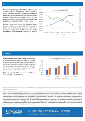 FX CARBON Power prices in Ireland are strongly linked to gas and Carbon prices by the volume of gas fired power stations in Ireland’s power market. Gas prices are in turn influenced by oil prices and exchange rates. Exclusion of Liability Disclaimer: Whilst the information in this document is based on information that Horizon Energy Group Limited considers reliable and endeavors to –ensure is current, neither Horizon Energy Group Limited, nor any of its officers, employees, agents or affiliates make any representation or warranty (express or implied) with respect to, and no such person shall have any responsibility or liability to, any person for either the accuracy, completeness or reliability of the information contained in this document or for delays in the provision of, or for not providing, any of this information. The provision of this information does not represent a recommendation or offer or the solicitation of an offer by Horizon Energy Group Limited to any person to enter into any transaction nor should any person rely on any information contained in this document for any decisions to be made by them. Any opinions expressed by Horizon Energy Group Limited in this document are personal to it and are subject to change without notice. Ownership of the copyright arising in this document belongs to Horizon Energy Group Limited and accordingly this document may not be copied, published, distributed or adapted in any fashion by any person without Horizon Energy Group Limited’s express prior written consent. Horizon Energy Group Limited is registered in Ireland with limited liability. Registered number: 452021 European carbon prices rose last week, following gains in the gas markets and diminishing hopes for a Ukraine peace deal. Market sentiment was also likely supported on Thursday by updates on the EU US trade agreement, –with the European Commission confirming a 15% tariff cap for the EU across sectors including automobiles, pharmaceuticals, and semiconductors. EUAs expiring in Dec-25 soared by about 3% for the week, ending at 72.53 EUR/tonne. 6668707274767880Dec25Dec26Dec27Dec28€/tonneThe change in Carbon Prices15.08.2522.08.251.15601.15801.16001.16201.16401.16601.16801.17001.17200.86200.86250.86300.86350.86400.86450.86500.86550.866015.08.2518.08.2519.08.2520.08.2521.08.2522.08.25€/$€/£The change in €/£/$ €/£€/$The Euro fell sharply against the US dollar last week, as the US PMI pointed to strengthening economic activity in August. Meanwhile, eurozone fundamentals remain fragile. Recent PMIs showed only a modest improvement, with the composite index reaching a 12-month high of 51.1, but growth in Germany and France continues to disappoint. The EUR/USD rate declined by 0.8% to 1.1608 on Friday. Sterling strengthened versus the European shared currency amid a series of upbeat UK economic indicators. On the Euro front, the lack of progress in Russia-Ukraine negotiations weighs on the shared currency. As such, the EUR/GBP pair rose by 0.2% for the week , closing at 0.8653.