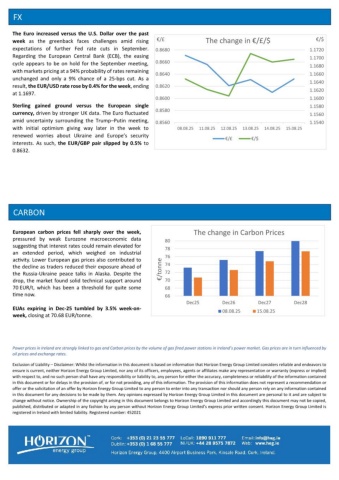 FX CARBON Power prices in Ireland are strongly linked to gas and Carbon prices by the volume of gas fired power stations in Ireland’s power market. Gas prices are in turn influenced by oil prices and exchange rates. Exclusion of Liability Disclaimer: Whilst the information in this document is based on information that Horizon Energy Group Limited considers reliable and endeavors to –ensure is current, neither Horizon Energy Group Limited, nor any of its officers, employees, agents or affiliates make any representation or warranty (express or implied) with respect to, and no such person shall have any responsibility or liability to, any person for either the accuracy, completeness or reliability of the information contained in this document or for delays in the provision of, or for not providing, any of this information. The provision of this information does not represent a recommendation or offer or the solicitation of an offer by Horizon Energy Group Limited to any person to enter into any transaction nor should any person rely on any information contained in this document for any decisions to be made by them. Any opinions expressed by Horizon Energy Group Limited in this document are personal to it and are subject to change without notice. Ownership of the copyright arising in this document belongs to Horizon Energy Group Limited and accordingly this document may not be copied, published, distributed or adapted in any fashion by any person without Horizon Energy Group Limited’s express prior written consent. Horizon Energy Group Limited is registered in Ireland with limited liability. Registered number: 452021 European carbon prices fell sharply over the week, pressured by weak Eurozone macroeconomic data suggesting that interest rates could remain elevated for an extended period, which weighed on industrial activity. Lower European gas prices also contributed to the decline as traders reduced their exposure ahead of the Russia-Ukraine peace talks in Alaska. Despite the drop, the market found solid technical support around 70 EUR/t, which has been a threshold for quite some time now. EUAs expiring in Dec-25 tumbled by 3.5% week-on-week, closing at 70.68 EUR/tonne. 6668707274767880Dec25Dec26Dec27Dec28€/tonneThe change in Carbon Prices08.08.2515.08.251.15401.15601.15801.16001.16201.16401.16601.16801.17001.17200.85600.85800.86000.86200.86400.86600.868008.08.2511.08.2512.08.2513.08.2514.08.2515.08.25€/$€/£The change in €/£/$ €/£€/$The Euro increased versus the U.S. Dollar over the past week as the greenback faces challenges amid rising expectations of further Fed rate cuts in September. Regarding the European Central Bank (ECB), the easing cycle appears to be on hold for the September meeting, with markets pricing at a 94% probability of rates remaining unchanged and only a 9% chance of a 25-bps cut. As a result, the EUR/USD rate rose by 0.4% for the week, ending at 1.1697. Sterling gained ground versus the European single currency, driven by stronger UK data. The Euro fluctuated amid uncertainty surrounding the Trump Putin meeting, –with initial optimism giving way later in the week to renewed worries about Ukraine and Europe’s security interests. As such, the EUR/GBP pair slipped by 0.5% to 0.8632.