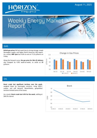 GAS OIL Brent crude lost significant territory over the week, weighed down by oversupply concerns, rising OPEC+ output, and soft demand. Nevertheless, geopolitical tensions limited some of the losses. As a result, Brent crude lost 4.4% for the week, settling at $66.59 a barrel. August 11, 2025 50658095110Q4 25Q1 26Q2 26Win25Sum26Win26p/thermChange in Gas Prices01.08.2508.08.2565666768697001.08.2504.08.2505.08.2506.08.2507.08.2508.08.25$/bblBrentBritish gas prices fell last week due to strong storage, ample Norwegian supply, and higher North American LNG export. As a result, NBP spot lost 4.6% to end at 77.25 p/therm on Friday. Along the forward curve, the gas price for Win-25 delivery also dropped by 4.9% week-on-week, to settle at 88 p/therm.