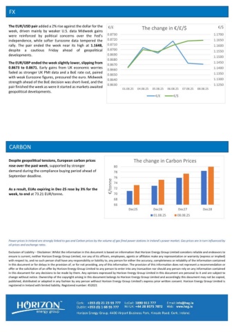 FX CARBON Power prices in Ireland are strongly linked to gas and Carbon prices by the volume of gas fired power stations in Ireland’s power market. Gas prices are in turn influenced by oil prices and exchange rates. Exclusion of Liability Disclaimer: Whilst the information in this document is based on information that Horizon Energy Group Limited considers reliable and endeavors to –ensure is current, neither Horizon Energy Group Limited, nor any of its officers, employees, agents or affiliates make any representation or warranty (express or implied) with respect to, and no such person shall have any responsibility or liability to, any person for either the accuracy, completeness or reliability of the information contained in this document or for delays in the provision of, or for not providing, any of this information. The provision of this information does not represent a recommendation or offer or the solicitation of an offer by Horizon Energy Group Limited to any person to enter into any transaction nor should any person rely on any information contained in this document for any decisions to be made by them. Any opinions expressed by Horizon Energy Group Limited in this document are personal to it and are subject to change without notice. Ownership of the copyright arising in this document belongs to Horizon Energy Group Limited and accordingly this document may not be copied, published, distributed or adapted in any fashion by any person without Horizon Energy Group Limited’s express prior written consent. Horizon Energy Group Limited is registered in Ireland with limited liability. Registered number: 452021 Despite geopolitical tensions, European carbon prices rose over the past week, supported by stronger demand during the compliance buying period ahead of September deadline. As a result, EUAs expiring in Dec-25 rose by 3% for the week, to end at 73.21 EUR/tonne. 6668707274767880Dec25Dec26Dec27Dec28€/tonneThe change in Carbon Prices01.08.2508.08.251.12501.13001.13501.14001.14501.15001.15501.16001.16501.17000.86300.86400.86500.86600.86700.86800.86900.87000.87100.87200.873001.08.2504.08.2505.08.2506.08.2507.08.2508.08.25€/$€/£The change in €/£/$ €/£€/$The EUR/USD pair added a 2% rise against the dollar for the week, driven mainly by weaker U.S. data Midweek gains were reinforced by political concerns over the Fed’s independence, while softer Eurozone data tempered the rally. The pair ended the week near its high at 1.1648, despite a cautious Friday ahead of geopolitical developments. The EUR/GBP ended the week slightly lower, slipping from 0.8673 to 0.8671. Early gains from UK economic worries faded as stronger UK PMI data and a BoE rate cut, paired with weak Eurozone figures, pressured the euro. Midweek strength ahead of the BoE decision was short-lived, and the pair finished the week as were it started as markets awaited geopolitical developments.