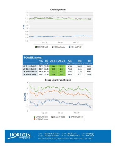 Exchange RatesPOWER (€/MWh) THUFRIVAR D-1 VAR W-1AVG.MAXMIN 27/11 28/11FROM THE BEGINNING OF THIS YEARUK Q1 26 BASE79.79 79.55-0.24-3.2987.69109.5579.55UK Q2 26 BASE68.67 68.59-0.08-2.3872.4883.9664.87UK SUM26 BASE68.10 68.00-0.1-1.9271.9083.6964.82UK WIN26 BASE76.02 75.94-0.08-1.4880.3289.7173.06Power Quarter and Season