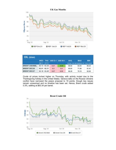 UK Gas MonthsOIL ($/bbl) WEDTHU VAR D-1 VAR W-1AVG.MAXMIN 26/11 27/11FROM THE BEGINNING OF THIS YEARBRENT USD/BBL63.13 63.340.21-0.0468.8282.0360.23BRENT DEC2662.01 62.310.30.465.9371.5661.41BRENT DEC2763.18 63.450.270.5566.2070.1062.65Crude oil prices inched higher on Thursday, with activity muted due to theThanksgiving holiday in the United States. Geneva talks on the Russia–Ukraineconflict have narrowed the peace proposal to 19 points, though key issuesremain unresolved and no timeline has been set. Hence, Brent crude added0.3%, settling at $63.34 per barrel.Brent Crude Oil