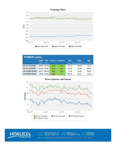 Exchange RatesPOWER (€/MWh) WEDTHU VAR D-1 VAR W-1AVG.MAXMIN 26/11 27/11FROM THE BEGINNING OF THIS YEARUK Q1 26 BASE80.54 79.79-0.75-4.2787.72109.5579.79UK Q2 26 BASE69.23 68.67-0.56-3.0772.5083.9664.87UK SUM26 BASE68.71 68.10-0.61-2.971.9283.6964.82UK WIN26 BASE76.40 76.02-0.38-380.3489.7173.06Power Quarter and Season