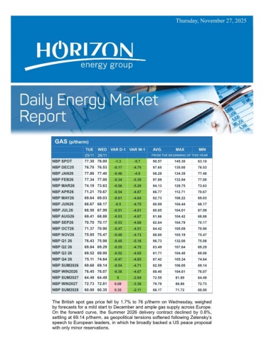 Thursday, November 27, 2025GAS (p/therm) TUEWED VAR D-1 VAR W-1AVG.MAXMIN 25/11 26/11FROM THE BEGINNING OF THIS YEARNBP SPOT77.30 76.00-1.3-5.790.57145.3063.10NBP DEC2576.70 76.53-0.17-4.7597.65135.0076.53NBP JAN2677.86 77.40-0.46-4.998.29134.3977.40NBP FEB2677.34 77.00-0.34-5.3997.89132.9477.00NBP MAR2674.19 73.63-0.56-5.2994.13128.7573.63NBP APR2671.21 70.67-0.54-4.8786.77112.7170.67NBP MAY2669.64 69.03-0.61-4.6482.73106.2269.03NBP JUN2668.67 68.17-0.5-4.7580.99104.4468.17NBP JUL2668.50 67.99-0.51-4.6180.85104.0167.99NBP AUG2669.41 68.88-0.53-4.6781.66104.4268.88NBP SEP2670.70 70.17-0.53-4.6882.64104.7970.17NBP OCT2671.37 70.90-0.47-4.5184.42105.0970.90NBP NOV2675.95 75.47-0.48-4.7388.00105.1975.47NBP Q1 2676.43 75.98-0.45-5.1896.73132.0075.98NBP Q2 2669.84 69.29-0.55-4.7583.49107.6469.29NBP Q3 2669.52 69.00-0.52-4.6581.71104.4069.00NBP Q4 2675.11 74.64-0.47-4.6587.42105.3474.64NBP SUM202669.68 69.14-0.54-4.7182.59106.0069.14NBP WIN202676.45 76.07-0.38-4.6788.40104.6176.07NBP SUM202764.49 64.490-2.9472.5581.8964.49NBP WIN202772.73 72.810.08-3.3679.7886.8672.73NBP SUM202860.00 60.350.35-2.1166.1771.7260.00The British spot gas price fell by 1.7% to 76 p/therm on Wednesday, weighedby forecasts for a mild start to December and ample gas supply across Europe.On the forward curve, the Summer 2026 delivery contract declined by 0.8%,settling at 69.14 p/therm, as geopolitical tensions softened following Zelensky’sspeech to European leaders, in which he broadly backed a US peace proposalwith only minor reservations.