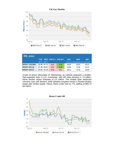 UK Gas MonthsOIL ($/bbl) TUEWED VAR D-1 VAR W-1AVG.MAXMIN 25/11 26/11FROM THE BEGINNING OF THIS YEARBRENT USD/BBL62.48 63.130.65-0.3868.8482.0360.23BRENT DEC2661.49 62.010.52-0.0665.9471.5661.41BRENT DEC2762.82 63.180.360.2366.2170.1062.65Crude oil prices rebounded on Wednesday, as markets assessed a smaller-than-expected draw in U.S. inventories, with API data showing a 1.9 million-barrel decline versus forecasts of 2.4 million. The modest draw reinforcedconcerns over soft demand, while tentative progress toward a Russia-Ukrainepeace plan limited upside. Hence, Brent crude rose by 1%, settling at $63.13per barrel.Brent Crude Oil