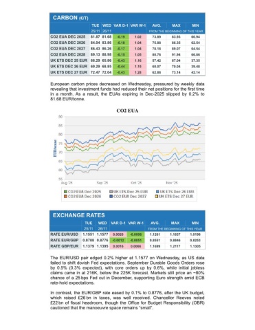 CARBON (€/T) TUE WED VAR D-1 VAR W-1AVG.MAXMIN 25/11 26/11FROM THE BEGINNING OF THIS YEARCO2 EUA DEC 202581.87 81.68-0.191.0273.8983.9360.94CO2 EUA DEC 202684.04 83.86-0.181.0475.8886.3562.54CO2 EUA DEC 202786.43 86.26-0.171.0478.1889.0764.54CO2 EUA DEC 202889.13 88.98-0.151.0580.7691.9466.86UK ETS DEC 25 EUR 66.29 65.86-0.431.1657.4267.0437.35UK ETS DEC 26 EUR 69.29 68.85-0.441.1560.0770.0439.48UK ETS DEC 27 EUR 72.47 72.04-0.431.2862.8873.1442.14European carbon prices decreased on Wednesday, pressured by weekly datarevealing that investment funds had reduced their net positions for the first timein a month. As a result, the EUAs expiring in Dec-2025 slipped by 0.2% to81.68 EUR/tonne.CO2 EUAEXCHANGE RATES TUEWEDVAR D-1 VAR W-1AVG.MAXMIN 25/1126/11FROM THE BEGINNING OF THIS YEARRATE EUR/USD1.1551 1.15770.0026-0.00061.12611.18371.0198RATE EUR/GBP0.8788 0.8776-0.0012-0.00510.85510.88460.8253RATE GBP/EUR1.1379 1.13950.00160.00661.16991.21171.1305The EUR/USD pair edged 0.2% higher at 1.1577 on Wednesday, as US datafailed to shift dovish Fed expectations. September Durable Goods Orders roseby 0.5% (0.3% expected), with core orders up by 0.6%, while initial joblessclaims came in at 216K, below the 225K forecast. Markets still price an ~80%chance of a 25 bps Fed cut in December, supporting Euro strength amid ECBrate-hold expectations.In contrast, the EUR/GBP rate eased by 0.1% to 0.8776, after the UK budget,which raised £26 bn in taxes, was well received. Chancellor Reeves noted£22 bn of fiscal headroom, though the Office for Budget Responsibility (OBR)cautioned that the manoeuvre space remains “small”.
