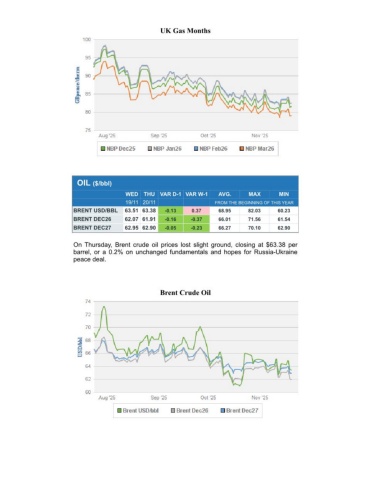 UK Gas MonthsOIL ($/bbl) WEDTHU VAR D-1 VAR W-1AVG.MAXMIN 19/11 20/11FROM THE BEGINNING OF THIS YEARBRENT USD/BBL63.51 63.38-0.130.3768.9582.0360.23BRENT DEC2662.07 61.91-0.16-0.3766.0171.5661.54BRENT DEC2762.95 62.90-0.05-0.2366.2770.1062.90On Thursday, Brent crude oil prices lost slight ground, closing at $63.38 perbarrel, or a 0.2% on unchanged fundamentals and hopes for Russia-Ukrainepeace deal.Brent Crude Oil