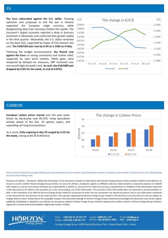 FX CARBON Power prices in Ireland are strongly linked to gas and Carbon prices by the volume of gas fired power stations in Ireland’s power market. Gas prices are in turn influenced by oil prices and exchange rates. Exclusion of Liability Disclaimer: Whilst the information in this document is based on information that Horizon Energy Group Limited considers reliable and endeavors to –ensure is current, neither Horizon Energy Group Limited, nor any of its officers, employees, agents or affiliates make any representation or warranty (express or implied) with respect to, and no such person shall have any responsibility or liability to, any person for either the accuracy, completeness or reliability of the information contained in this document or for delays in the provision of, or for not providing, any of this information. The provision of this information does not represent a recommendation or offer or the solicitation of an offer by Horizon Energy Group Limited to any person to enter into any transaction nor should any person rely on any information contained in this document for any decisions to be made by them. Any opinions expressed by Horizon Energy Group Limited in this document are personal to it and are subject to change without notice. Ownership of the copyright arising in this document belongs to Horizon Energy Group Limited and accordingly this document may not be copied, published, distributed or adapted in any fashion by any person without Horizon Energy Group Limited’s express prior written consent. Horizon Energy Group Limited is registered in Ireland with limited liability. Registered number: 452021 European carbon prices soared over the past week, driven by dip-buying near 81 EUR, rising speculative activity ahead of the Dec. 10 options expiry, and expanding net-long fund positions. As a result, EUAs expiring in Dec-25 surged by 3.5% for the week, closing at 83.26 EUR/tonne. 7580859095Dec25Dec26Dec27Dec28€/tonneThe change in Carbon Prices21.11.2528.11.251.14801.15001.15201.15401.15601.15801.16000.87200.87300.87400.87500.87600.87700.87800.87900.88000.881021.11.2524.11.2525.11.2526.11.2527.11.2528.11.25€/$€/£The change in €/£/$ €/£€/$The Euro rebounded against the U.S. dollar. Growing optimism over proposals to end the war in Ukraine supported the European single currency, while disappointing data from Germany limited the upside. The Eurozone’s largest economy reported a drop in business sentiment in November and confirmed that growth stalled in the third quarter. Meanwhile, the U.S. dollar remained on the back foot, supported by hopes of Fed interest rate cuts. The EUR/USD pair rose by 0.4% to 1.1566 on Friday. Following the budget announcement, the Pound rose against the Euro on easing uncertainty and market relief, supported by calm bond markets. While gains were tempered by delayed tax measures, GBP remained near one-month highs by week’s end. As such, the EUR/GBP pair dropped by 0.6% for the week, to end at 0.8752.