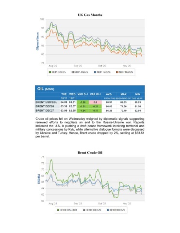 UK Gas MonthsOIL ($/bbl) TUEWED VAR D-1 VAR W-1AVG.MAXMIN 18/11 19/11FROM THE BEGINNING OF THIS YEARBRENT USD/BBL64.89 63.51-1.380.868.9782.0360.23BRENT DEC2663.38 62.07-1.31-0.2166.0371.5661.54BRENT DEC2763.99 62.95-1.04-0.1766.2870.1062.94Crude oil prices fell on Wednesday weighed by diplomatic signals suggestingrenewed efforts to negotiate an end to the Russia-Ukraine war. Reportsindicated the U.S. is pushing a draft peace framework involving territorial andmilitary concessions by Kyiv, while alternative dialogue formats were discussedby Ukraine and Turkey. Hence, Brent crude dropped by 2%, settling at $63.51per barrel.Brent Crude Oil