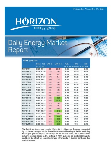 Wednesday, November 19, 2025GAS (p/therm) MONTUEVAR D-1 VAR W-1AVG.MAXMIN 17/11 18/11FROM THE BEGINNING OF THIS YEARNBP SPOT82.25 83.150.920.0590.86145.3063.10NBP DEC2582.36 83.501.142.4498.15135.0080.03NBP JAN2683.31 84.220.911.698.78134.3981.23NBP FEB2683.46 84.200.741.498.37132.9481.42NBP MAR2680.18 80.870.691.0494.61128.7578.54NBP APR2676.48 76.970.490.3987.13112.7175.49NBP MAY2674.08 74.760.680.4783.03106.2273.23NBP JUN2673.08 73.770.690.0681.27104.4471.89NBP JUL2673.07 73.680.610.1681.13104.0172.40NBP AUG2674.02 74.630.610.0681.94104.4273.26NBP SEP2675.32 75.930.610.3882.91104.7973.41NBP OCT2675.96 76.490.53-0.2484.72105.0975.55NBP NOV2680.90 81.280.38-0.2688.27105.1980.24NBP Q1 2682.28 83.060.781.3497.21132.0080.36NBP Q2 2674.54 75.160.620.3183.80107.6473.78NBP Q3 2674.12 74.730.610.1981.98104.4073.04NBP Q4 2679.94 80.370.43-0.1887.69105.3479.57NBP SUM202674.33 74.950.620.2682.89106.0073.59NBP WIN202681.45 81.850.4-0.0988.67104.6180.91NBP SUM202768.26 68.440.18-0.3572.7381.8967.41NBP WIN202777.00 77.180.18-0.1879.9286.8675.08NBP SUM202863.09 63.240.15-0.3466.3071.7262.79The British spot gas price rose by 1% to 83.15 p/therm on Tuesday, supportedby unplanned outages at the Aasta Hansteen and Dvalin gas fields restrictingNorwegian gas flows by 20.8mcm/day. On the forward curve, the Summer 2026delivery contract added 0.8%, settling at 74.95 p/therm, as solid global supplycould still be offset by possible storage withdrawals in Europe tightening themarket balance.