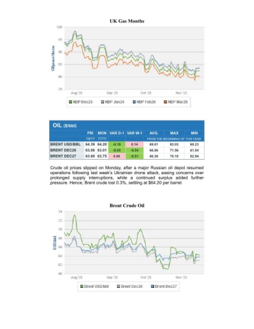 UK Gas MonthsOIL ($/bbl) FRIMON VAR D-1 VAR W-1AVG.MAXMIN 14/11 17/11FROM THE BEGINNING OF THIS YEARBRENT USD/BBL64.39 64.20-0.190.1469.0182.0360.23BRENT DEC2663.06 63.01-0.05-0.5466.0671.5661.54BRENT DEC2763.69 63.750.06-0.5166.3070.1062.94Crude oil prices slipped on Monday, after a major Russian oil depot resumedoperations following last week’s Ukrainian drone attack, easing concerns overprolonged supply interruptions, while a continued surplus added furtherpressure. Hence, Brent crude lost 0.3%, settling at $64.20 per barrel.Brent Crude Oil