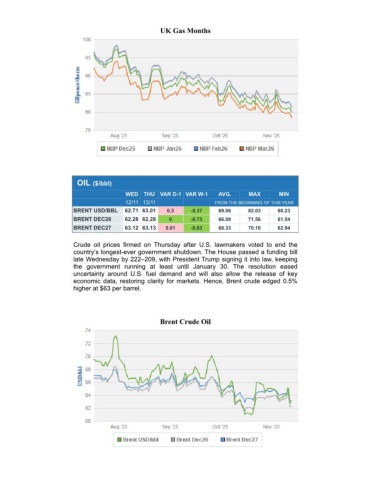 UK Gas MonthsOIL ($/bbl) WEDTHU VAR D-1 VAR W-1AVG.MAXMIN 12/11 13/11FROM THE BEGINNING OF THIS YEARBRENT USD/BBL62.71 63.010.3-0.3769.0682.0360.23BRENT DEC2662.28 62.280-0.7366.0971.5661.54BRENT DEC2763.12 63.130.01-0.8366.3370.1062.94Crude oil prices firmed on Thursday after U.S. lawmakers voted to end thecountry’s longest-ever government shutdown. The House passed a funding billlate Wednesday by 222–209, with President Trump signing it into law, keepingthe government running at least until January 30. The resolution easeduncertainty around U.S. fuel demand and will also allow the release of keyeconomic data, restoring clarity for markets. Hence, Brent crude edged 0.5%higher at $63 per barrel.Brent Crude Oil
