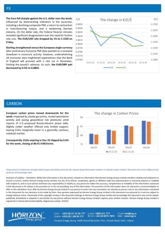 FX CARBON Power prices in Ireland are strongly linked to gas and Carbon prices by the volume of gas fired power stations in Ireland’s power market. Gas prices are in turn influenced by oil prices and exchange rates. Exclusion of Liability Disclaimer: Whilst the information in this document is based on information that Horizon Energy Group Limited considers reliable and endeavors to –ensure is current, neither Horizon Energy Group Limited, nor any of its officers, employees, agents or affiliates make any representation or warranty (express or implied) with respect to, and no such person shall have any responsibility or liability to, any person for either the accuracy, completeness or reliability of the information contained in this document or for delays in the provision of, or for not providing, any of this information. The provision of this information does not represent a recommendation or offer or the solicitation of an offer by Horizon Energy Group Limited to any person to enter into any transaction nor should any person rely on any information contained in this document for any decisions to be made by them. Any opinions expressed by Horizon Energy Group Limited in this document are personal to it and are subject to change without notice. Ownership of the copyright arising in this document belongs to Horizon Energy Group Limited and accordingly this document may not be copied, published, distributed or adapted in any fashion by any person without Horizon Energy Group Limited’s express prior written consent. Horizon Energy Group Limited is registered in Ireland with limited liability. Registered number: 452021 European carbon prices moved downwards for the week, impacted by steady gas prices, muted speculative activity and easing geopolitical risk premiums amid reports of U.S.-proposed Russia-Ukraine peace talks. Slightly colder weather offered only limited support, leaving EUAs marginally lower in a generally cautious, subdued market. Consequently, EUAs expiring in Dec-25 slipped by 0.6% for the week, closing at 80.41 EUR/tonne. 75808590Dec25Dec26Dec27Dec28€/tonneThe change in Carbon Prices14.11.2521.11.251.14001.14501.15001.15501.16001.16501.17000.87600.87700.87800.87900.88000.88100.88200.88300.88400.885014.11.2517.11.2518.11.2519.11.2520.11.2521.11.25€/$€/£The change in €/£/$ €/£€/$The Euro fell sharply against the U.S. dollar over the week, influenced by deteriorating indicators in the eurozone, including a declining composite PMI, a return to contraction in manufacturing output, and a weakening German industry. On the dollar side, the Federal Reserve minutes revealed significant disagreement over the need for further rate cuts. The EUR/USD rate dropped by 1% to 1.1520 on Friday. Sterling strengthened versus the European single currency after preliminary Eurozone PMI data pointed to a renewed slowdown in economic activity. However, underwhelming UK economic data heightened expectations that the Bank of England will proceed with a rate cut in December, limiting the pound’s advance. As such, the EUR/GBP pair decreased by 0.5% to 0.8803.