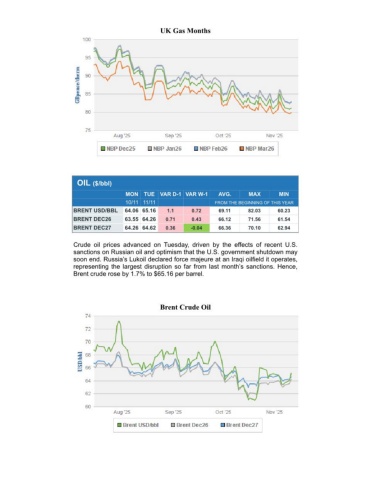 UK Gas MonthsOIL ($/bbl) MONTUE VAR D-1 VAR W-1AVG.MAXMIN 10/11 11/11FROM THE BEGINNING OF THIS YEARBRENT USD/BBL64.06 65.161.10.7269.1182.0360.23BRENT DEC2663.55 64.260.710.4366.1271.5661.54BRENT DEC2764.26 64.620.36-0.0466.3670.1062.94Crude oil prices advanced on Tuesday, driven by the effects of recent U.S.sanctions on Russian oil and optimism that the U.S. government shutdown maysoon end. Russia’s Lukoil declared force majeure at an Iraqi oilfield it operates,representing the largest disruption so far from last month’s sanctions. Hence,Brent crude rose by 1.7% to $65.16 per barrel.Brent Crude Oil