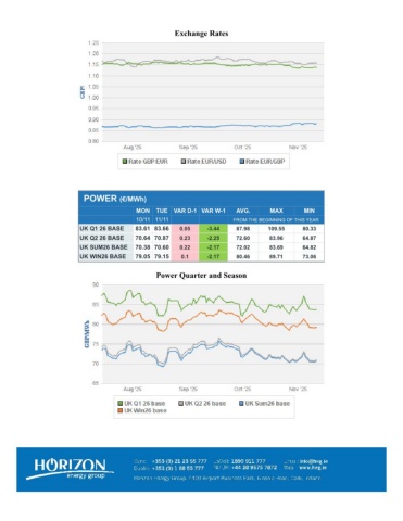 Exchange RatesPOWER (€/MWh) MONTUE VAR D-1 VAR W-1AVG.MAXMIN 10/11 11/11FROM THE BEGINNING OF THIS YEARUK Q1 26 BASE83.61 83.660.05-3.4487.98109.5580.33UK Q2 26 BASE70.64 70.870.23-2.2572.6083.9664.87UK SUM26 BASE70.38 70.600.22-2.1772.0283.6964.82UK WIN26 BASE79.05 79.150.1-2.1780.4689.7173.06Power Quarter and Season